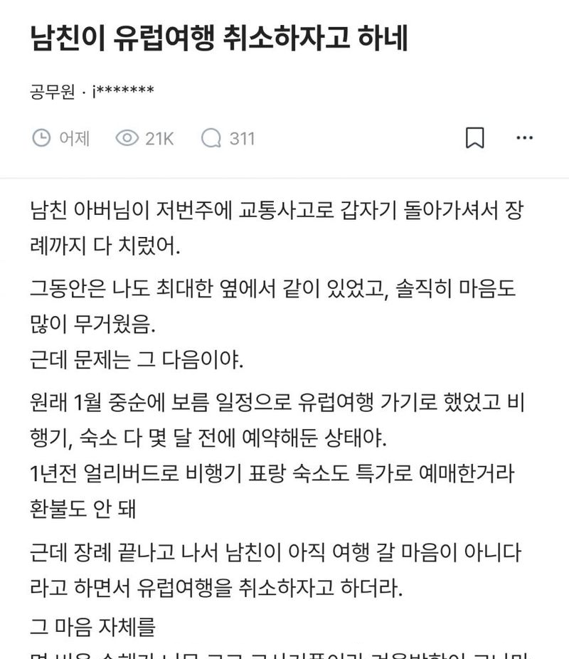 유머남친이 아버지가 돌아가셔서 유럽여행을 취소하자고 하네위키뉴스 기자입력북마크공유가글자크기프린트댓글 남친이 아버지가 돌아가셔서 유럽여행을 취소하자고 하네 위키뉴스 기자[email protected]카카오톡페이스북트위터밴드URL복사