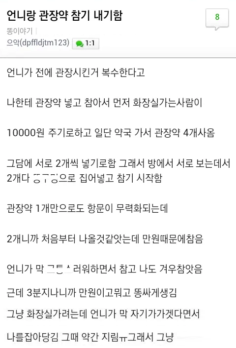유머언니랑 관장약 참기 내기함 ㅗㅜㅑ위키뉴스 기자입력북마크공유가글자크기프린트댓글언니랑 관장약 참기 내기함 ㅗㅜㅑ 만원 주고 똥 지리게 만들기~ ㅋㅋㅋ근데 관장약은 참겠다는 의지로 어찌해볼 수 있는 수준이 아닐 텐데... ㄷㄷㄷ위키뉴스 기자[email protected]카카오톡페이스북트위터밴드URL복사