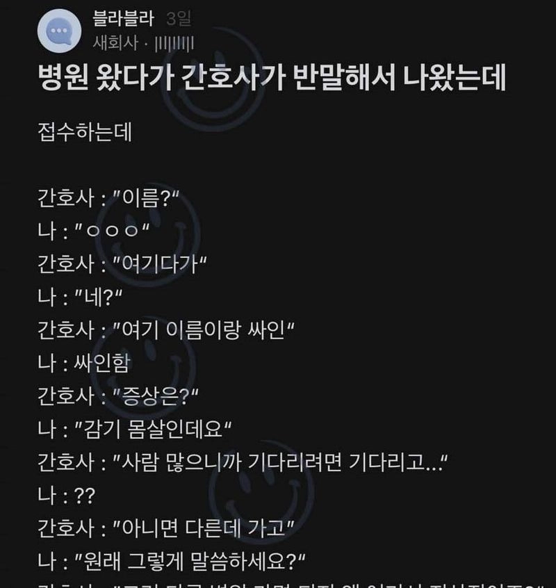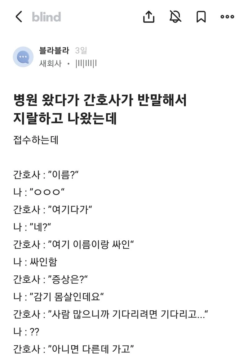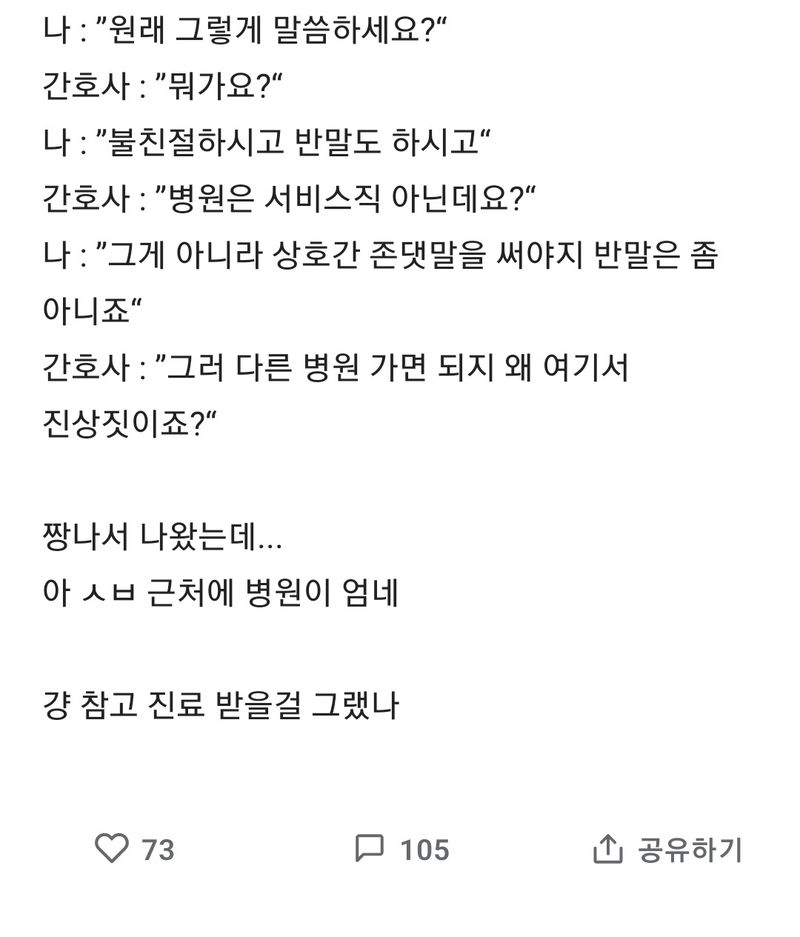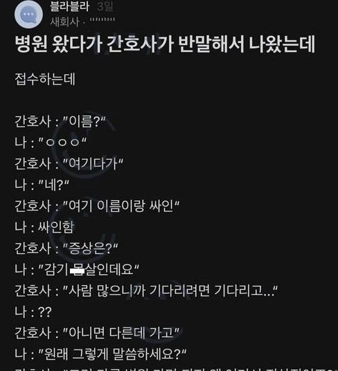 리와인드뉴스병원 왔다가 간호사가 반말해서 걍 나왔는데위키뉴스 기자입력북마크공유가글자크기프린트댓글 병원 왔다가 간호사가 반말해서 걍 나왔는데 위키뉴스 기자[email protected]카카오톡페이스북트위터밴드URL복사