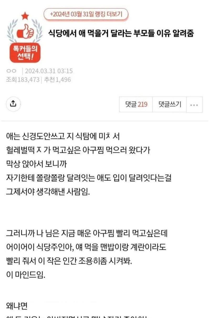 리와인드뉴스식당에서 애 먹을거 달라는 부모들 이유 알려줌.jpg위키뉴스 기자입력북마크공유가글자크기프린트댓글 식당에서 애 먹을거 달라는 부모들 이유 알려줌.jpg 구구절절 맞는말이라 할말이없네...위키뉴스 기자[email protected]카카오톡페이스북트위터밴드URL복사