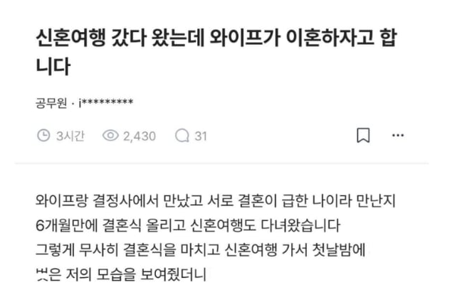 리와인드뉴스신혼여행 다녀왔는데 와이프가 이혼하자고 합니다.위키뉴스 기자입력북마크공유가글자크기프린트댓글 신혼여행 다녀왔는데 와이프가 이혼하자고 합니다. 위키뉴스 기자[email protected]카카오톡페이스북트위터밴드URL복사