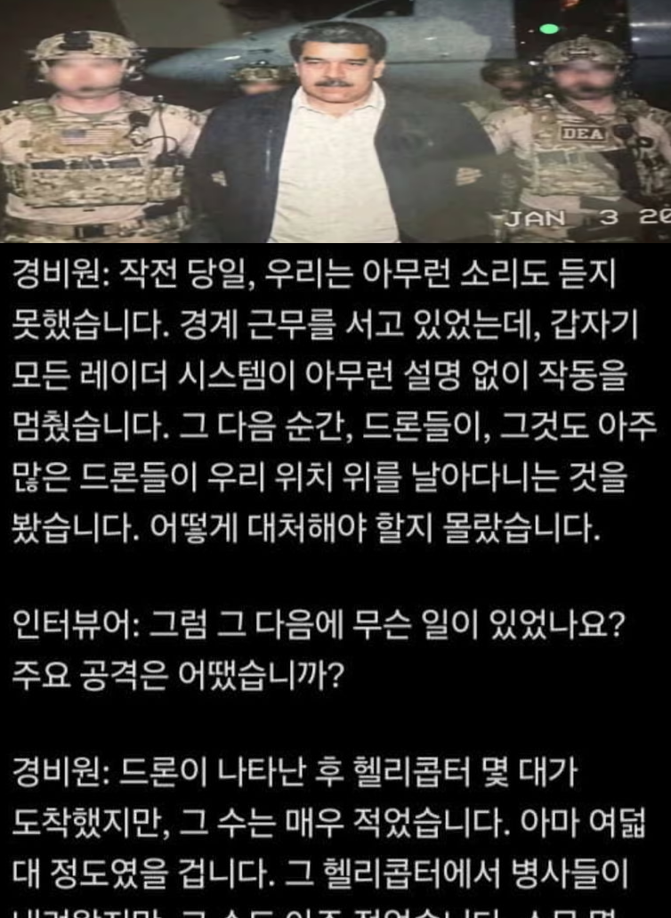 유머마두로 체포 시 미군측 사상자가 없던 이유위키뉴스 기자입력북마크공유가글자크기프린트댓글마두로 체포 시 미군측 사상자가 없던 이유 드론으로 경비들 타겟팅해서 음파 공격한건가?노이즈캔슬링으로 방어가능?위키뉴스 기자[email protected]카카오톡페이스북트위터밴드URL복사