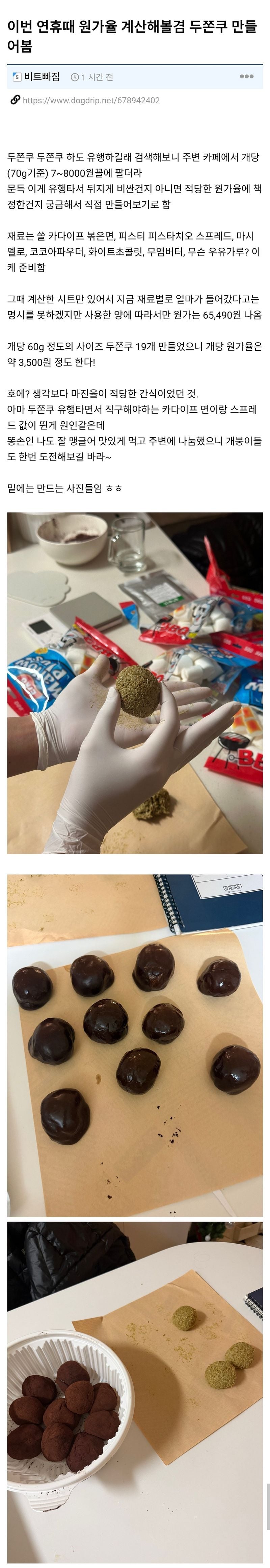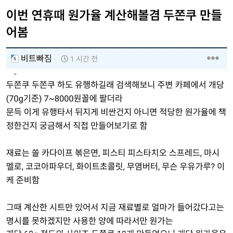 유머두바이쫀득쿠키 실제 원재료값위키뉴스 기자입력북마크공유가글자크기프린트댓글두바이쫀득쿠키 실제 원재료값 카다이프 포함 재료값 65,490원 이걸로 두쫀쿠 60g 19개가 만들어짐 개당 대략 3,440원위키뉴스 기자[email protected]카카오톡페이스북트위터밴드URL복사