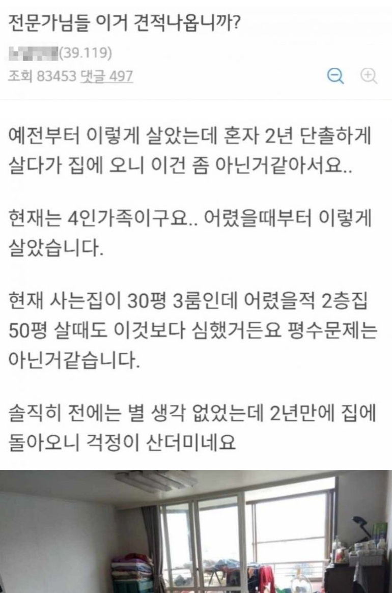 유머4인가족이 사는 어느 디시인의 집 상태 ㅎㄷㄷ위키뉴스 기자입력북마크공유가글자크기프린트댓글4인가족이 사는 어느 디시인의 집 상태 ㅎㄷㄷ 위키뉴스 기자[email protected]카카오톡페이스북트위터밴드URL복사