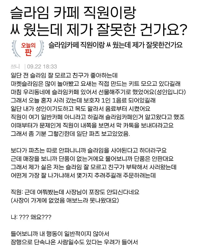 유머슬라임 카페 직원이랑 ㅆ웠는데 제가 잘못한 건가요?위키뉴스 기자입력북마크공유가글자크기프린트댓글슬라임카페 직원이랑 싸웠는데 제가 잘못한건가요? 위키뉴스 기자[email protected]카카오톡페이스북트위터밴드URL복사