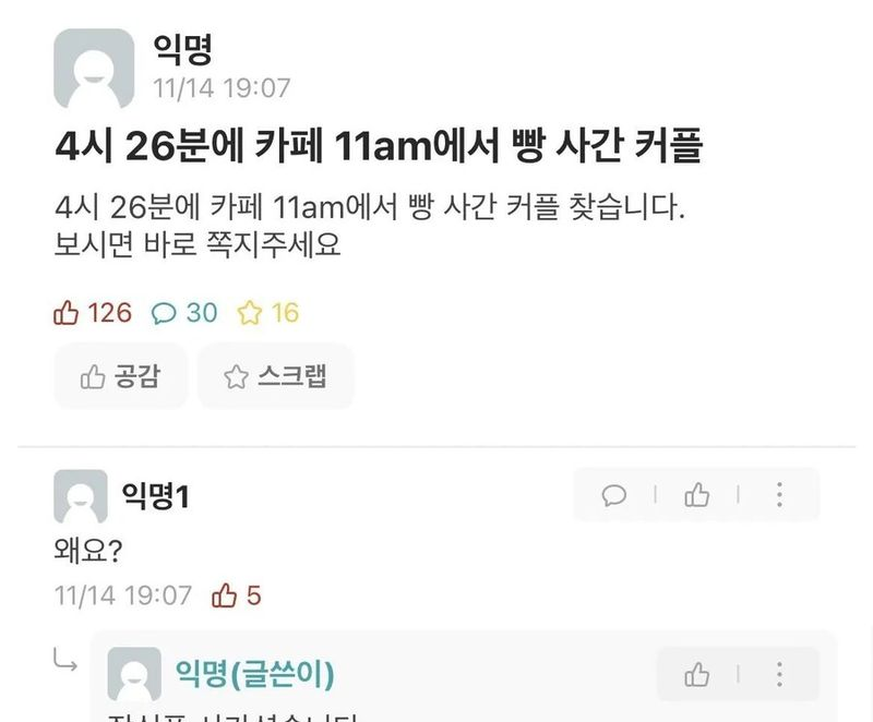 유머4시 26분에 카페에서 빵 사간 커플 찾습니다위키뉴스 기자입력북마크공유가글자크기프린트댓글4시 26분에 카페에서 빵 사간 커플 찾습니다 위키뉴스 기자[email protected]카카오톡페이스북트위터밴드URL복사