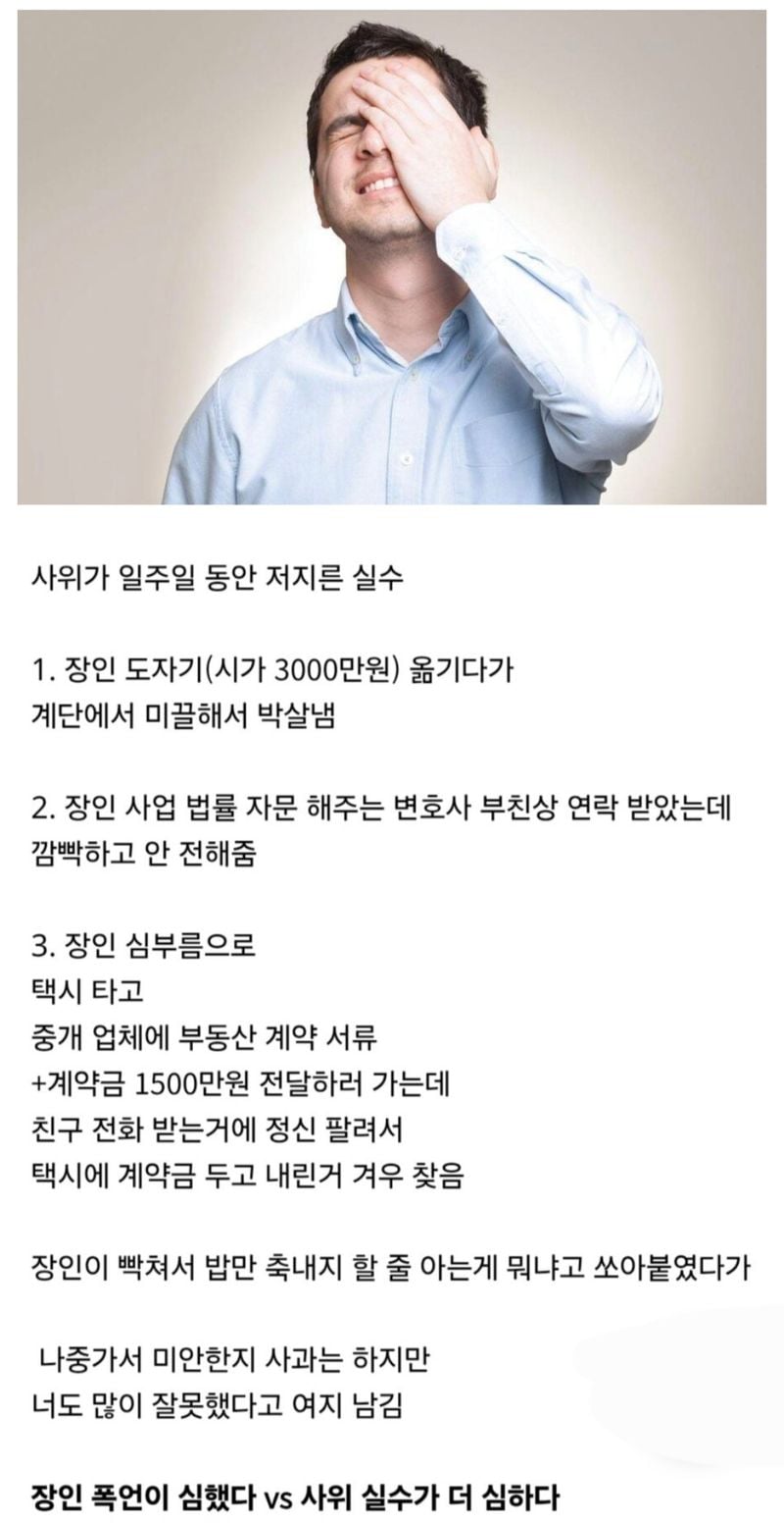 유머자기 사위에게 밥벌레라고 폭언한 장인어른위키뉴스 기자입력북마크공유가글자크기프린트댓글 자기 사위에게 밥벌레라고 폭언한 장인어른실수 연발하는 사위. 위키뉴스 기자[email protected]카카오톡페이스북트위터밴드URL복사