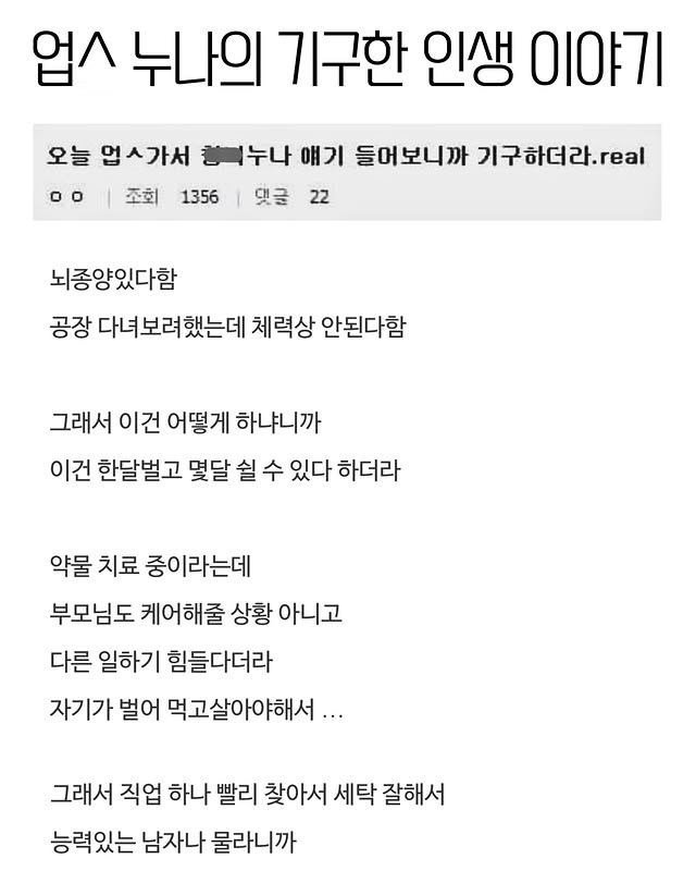 유머업ㅅ 누나의 기구한 인생 이야기위키뉴스 기자입력북마크공유가글자크기프린트댓글화류계 누나의 기구한 인생 이야기 ㄷㄷ 위키뉴스 기자[email protected]카카오톡페이스북트위터밴드URL복사