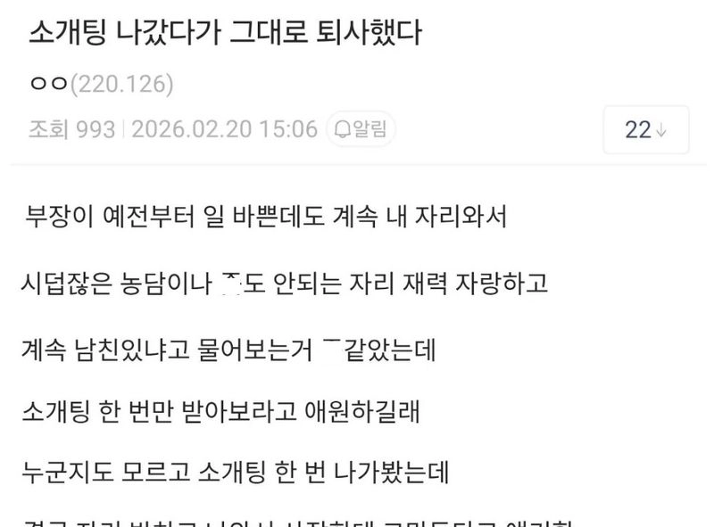 리와인드뉴스소개팅 나갔다가 그대로 퇴사했다.jpg위키뉴스 기자입력북마크공유가글자크기프린트댓글 소개팅 나갔다가 그대로 퇴사했다.jpg 이거 실화에요,,.,?ㄷㄷ위키뉴스 기자[email protected]카카오톡페이스북트위터밴드URL복사