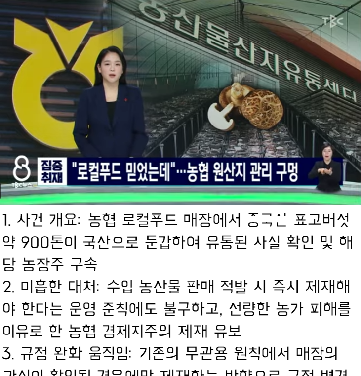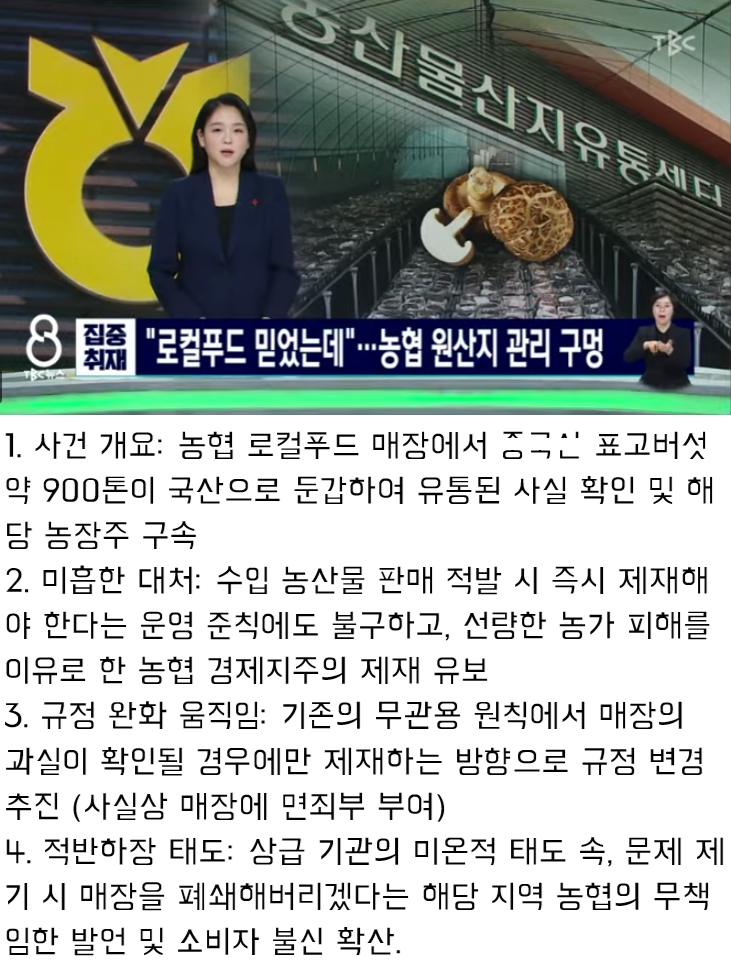 1. 사건 개요: 농협 로컬푸드 매장에서 중국산 표고버섯 약 900톤이 국산으로 둔갑하여 유통된 사실 확인 및 해당 농장주 구속.