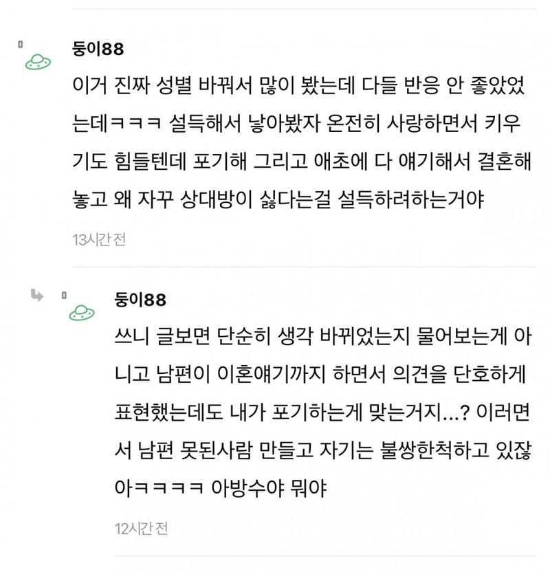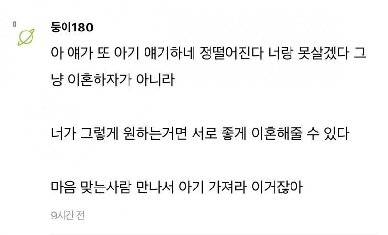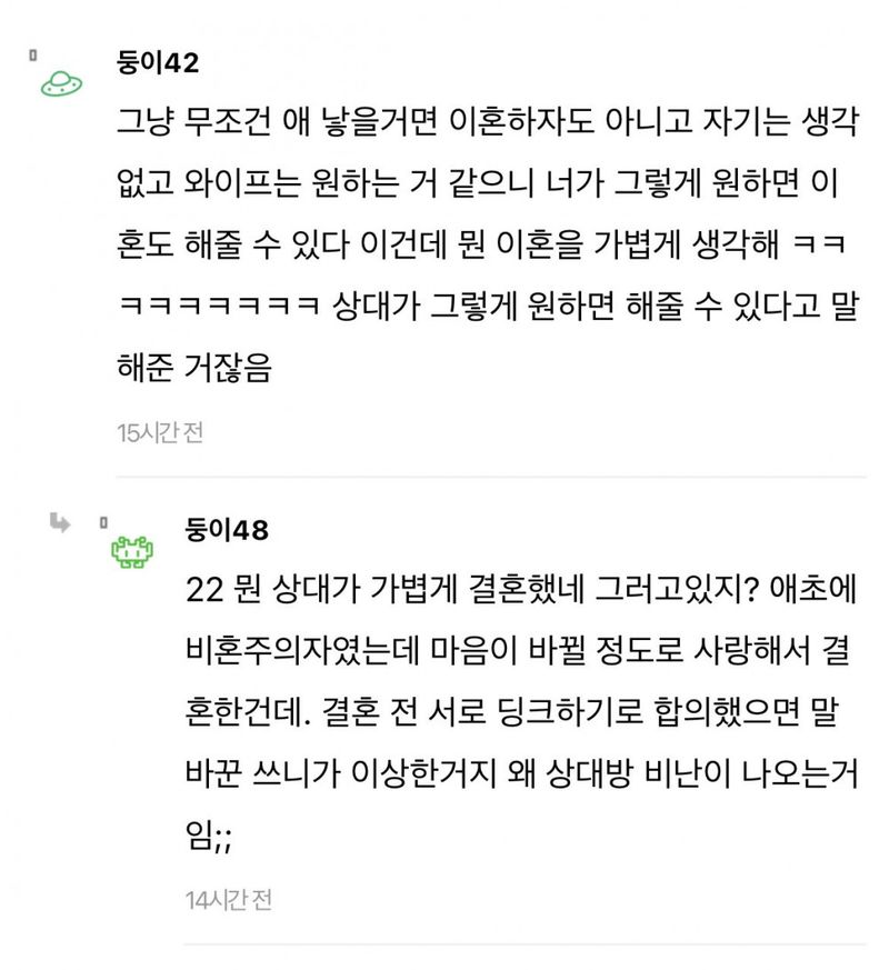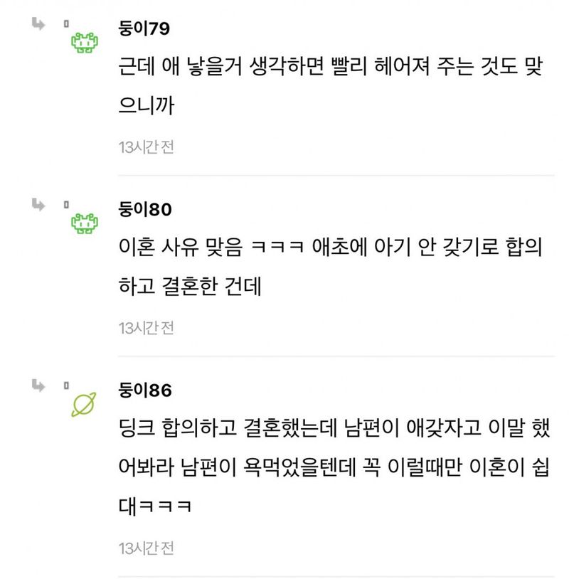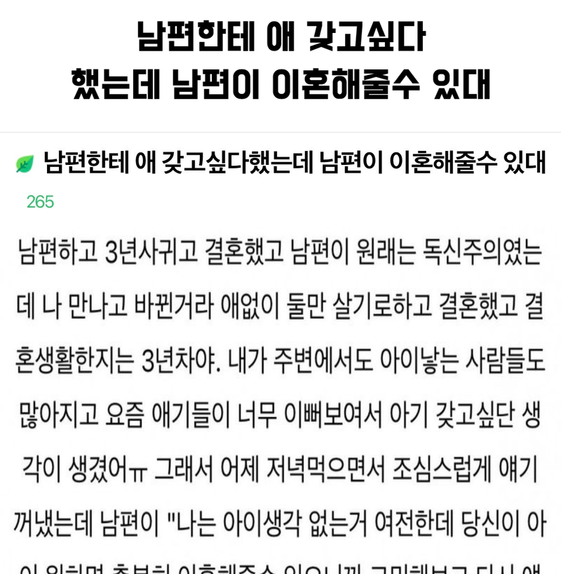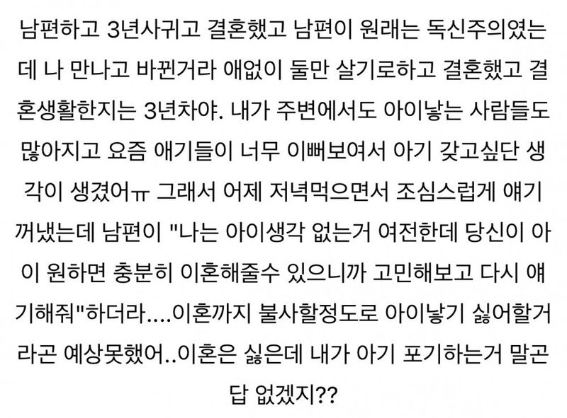 유머남편한테 애 갖고싶다했는데 남편이 이혼해줄수 있대위키뉴스 기자입력북마크공유가글자크기프린트댓글남편한테 애 갖고싶다했는데 남편이 이혼해줄수 있대 위키뉴스 기자[email protected]카카오톡페이스북트위터밴드URL복사