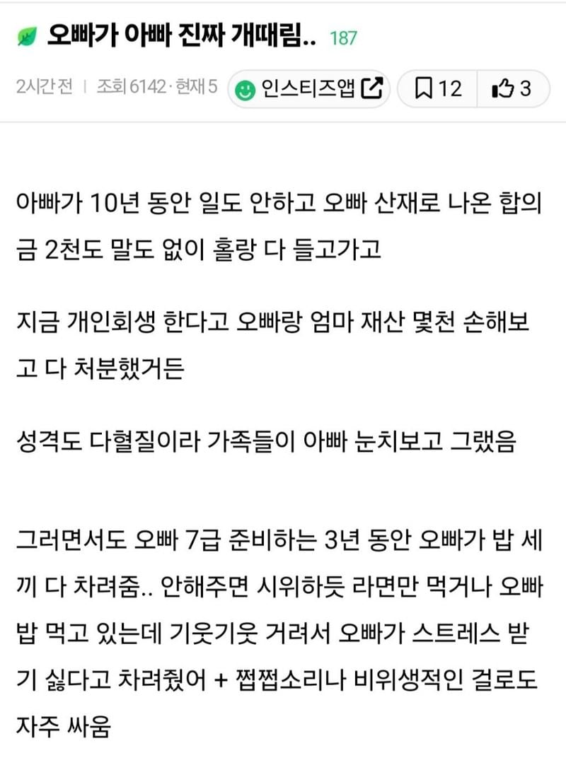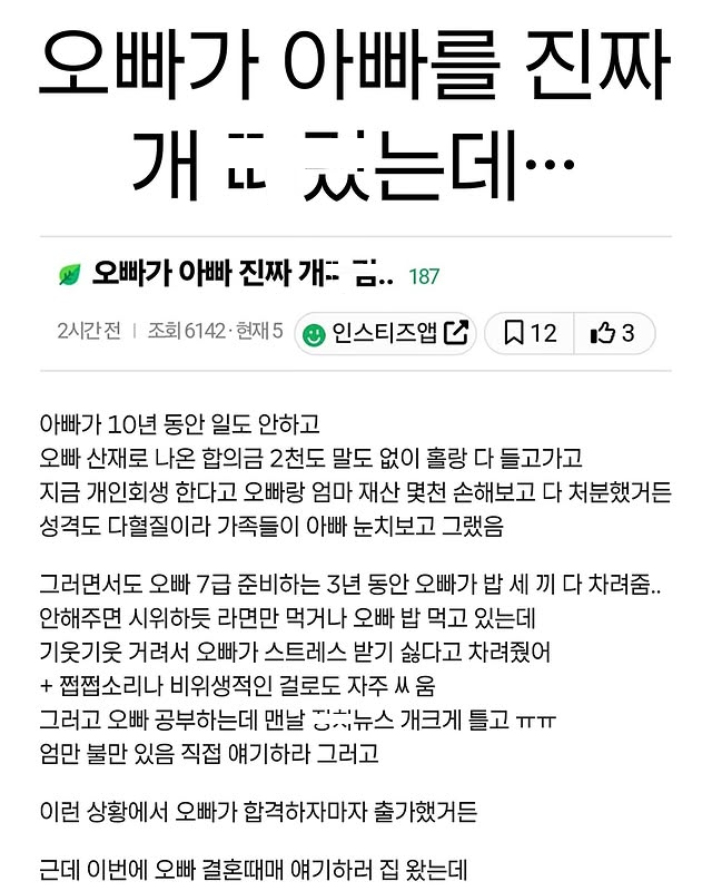 유머오빠가 아빠를 진짜 개 ㄸ렸는데위키뉴스 기자입력북마크공유가글자크기프린트댓글오빠가 아빠를 진짜 개 때렸는데… 위키뉴스 기자[email protected]카카오톡페이스북트위터밴드URL복사
