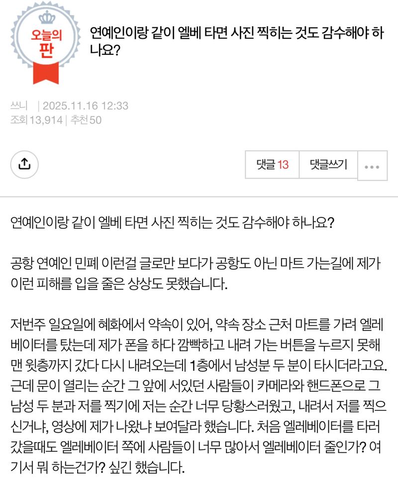 유머연예인이랑 같이 엘베탔다가 사진찍혀서 경찰에 신고했는데위키뉴스 기자입력북마크공유가글자크기프린트댓글연예인이랑 같이 엘베탔다가 사진찍혀서 신고했는데.. 위키뉴스 기자[email protected]카카오톡페이스북트위터밴드URL복사