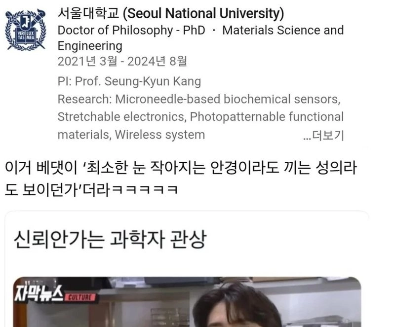 리와인드뉴스신뢰 1도 안가는 과학자 관상 레전드ㄷㄷ.jpg위키뉴스 기자입력북마크공유가글자크기프린트댓글 신뢰 1도 안가는 과학자 관상 레전드ㄷㄷ.jpg 강주혁카이스트 재료공학 학사(4년)+석사(2년) 서울대 재료공학 박사 (3년 6개월)위키뉴스 기자[email protected]카카오톡페이스북트위터밴드URL복사