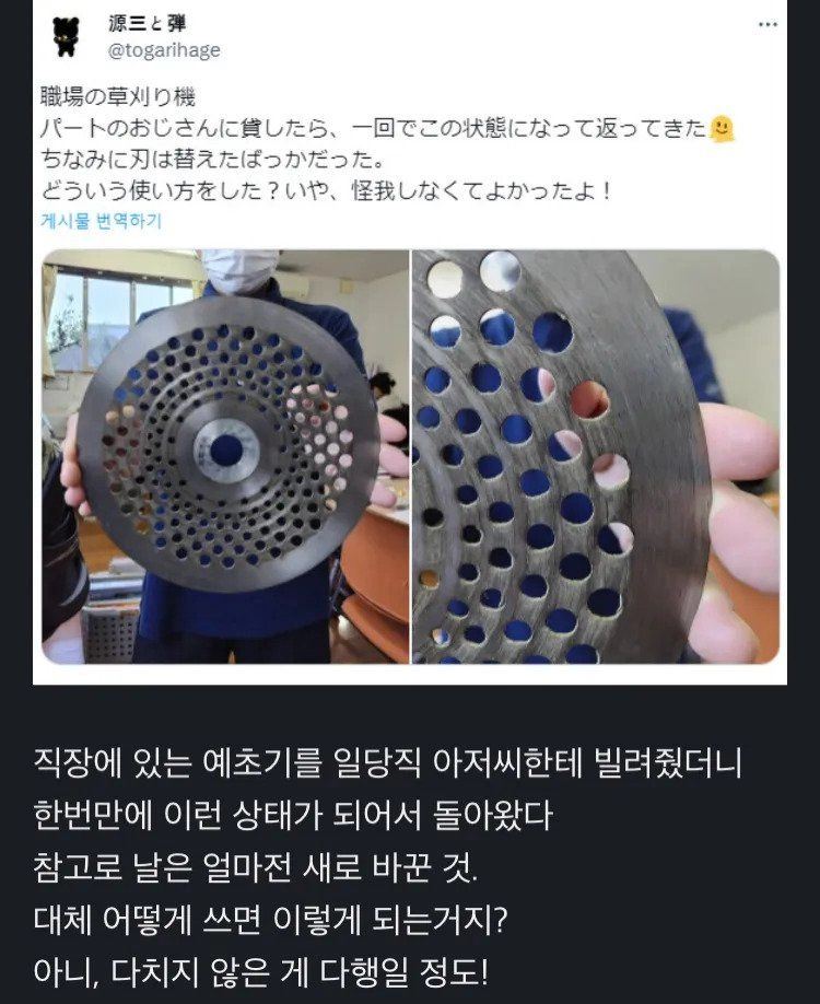 리와인드뉴스예초기 빌려주고 돌려받았는데.위키뉴스 기자입력북마크공유가글자크기프린트댓글 예초기 빌려주고 돌려받았는데. 위키뉴스 기자[email protected]카카오톡페이스북트위터밴드URL복사