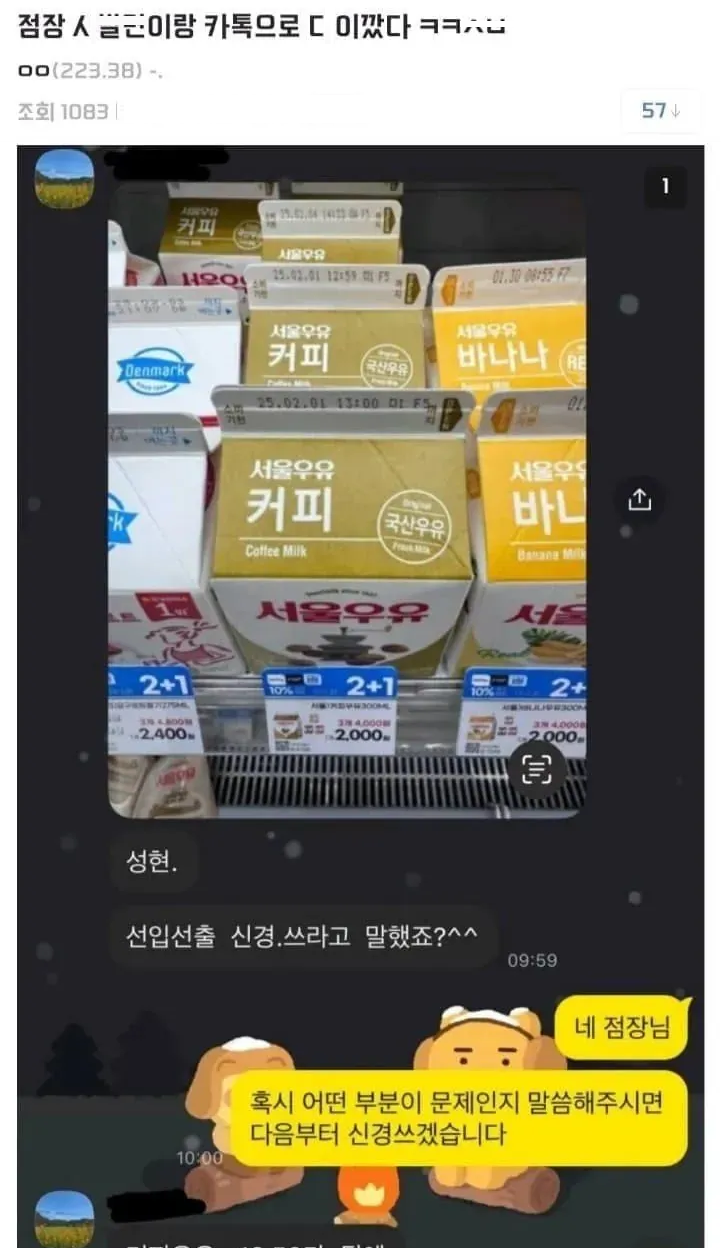 유머점장이랑 카톡으로 ㄷr이깐 편도리위키뉴스 기자입력북마크공유가글자크기프린트댓글점장이랑 카톡으로 ㄷr이깐 편도리 태도! 열정! 집중!위키뉴스 기자[email protected]카카오톡페이스북트위터밴드URL복사