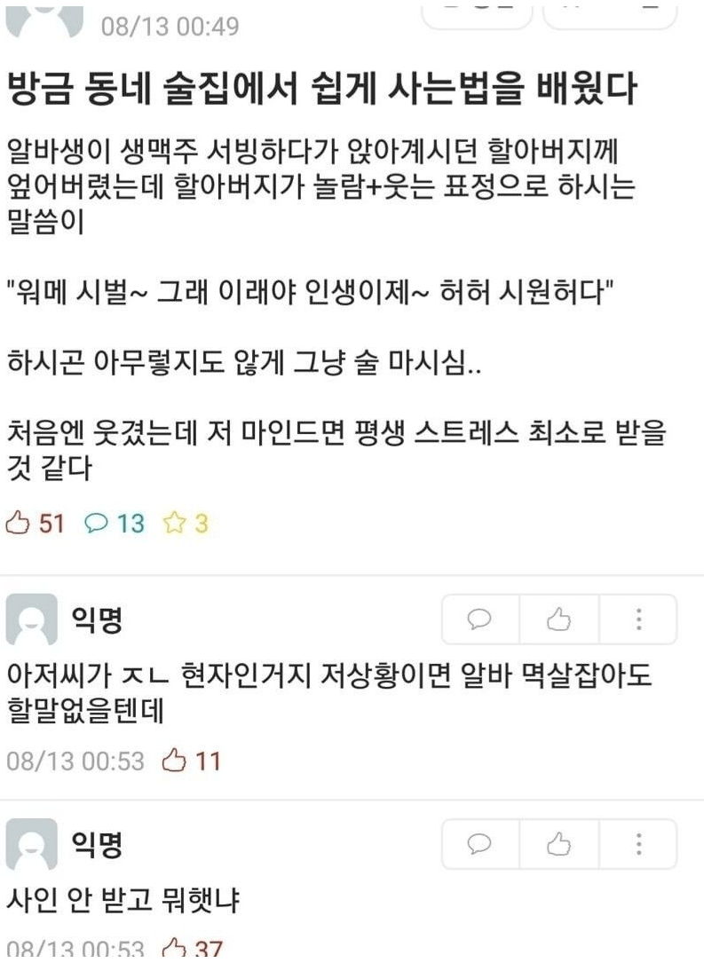 유머방금 동네 술집에서 할아버지에게 인생 쉽게 사는 법을 배웠다위키뉴스 기자입력북마크공유가글자크기프린트댓글방금 동네 술집에서 인생 쉽게 사는 법을 배웠다 위키뉴스 기자[email protected]카카오톡페이스북트위터밴드URL복사