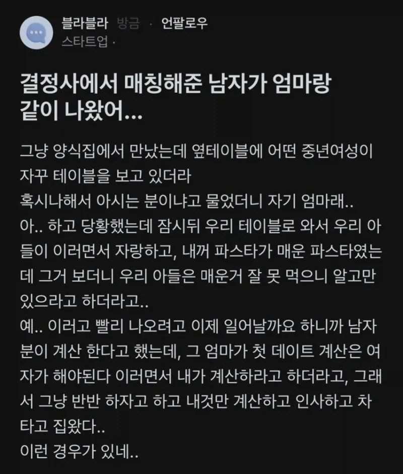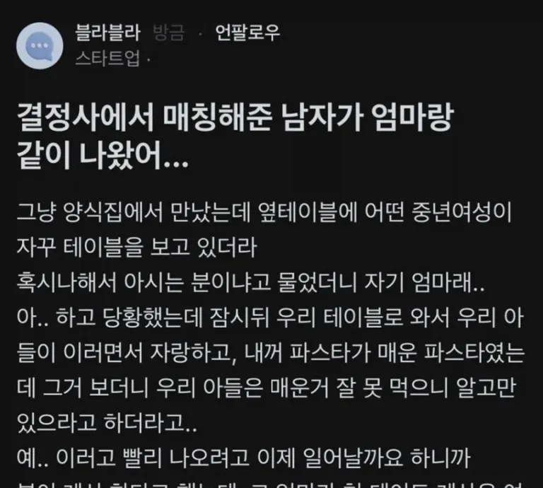 유머결정사에서 매칭해준 남자가 엄마랑 같이 나왔어위키뉴스 기자입력북마크공유가글자크기프린트댓글결정사에서 매칭해준 남자가 엄마랑 같이 나왔어위키뉴스 기자[email protected]카카오톡페이스북트위터밴드URL복사