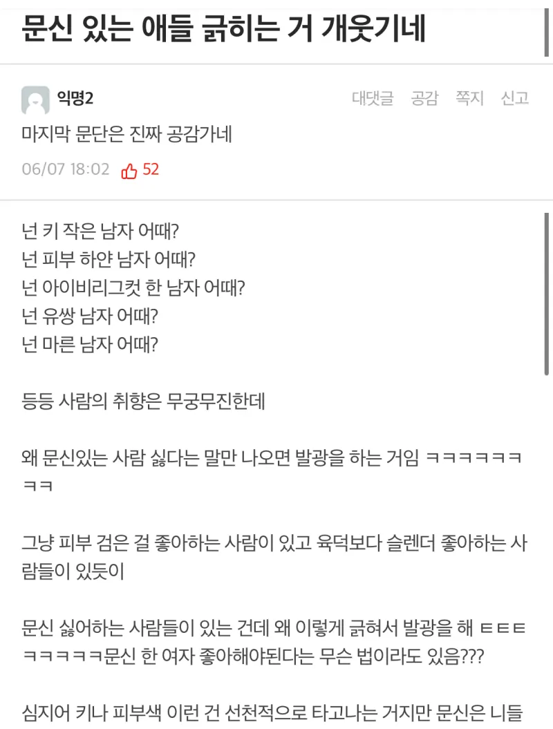 생각해보니 우리나라는 "우리나라사람끼리 인종차별"이란 개념이 없어서 키가 작네 얼굴이 어쩌네 피부가 나쁘네 이렇게 남의 외모 평가하는거 숨쉬듯이 하잖음?