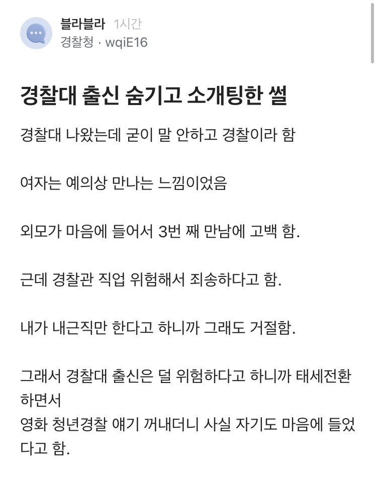 유머경찰대 출신 숨기고 소개팅 한 썰위키뉴스 기자입력북마크공유가글자크기프린트댓글경찰대 출신 숨기고 소개팅 한 썰 정보) 경찰대 출신은 경위부터 시작(순경-경장-경사-경위-경감-…)위키뉴스 기자[email protected]카카오톡페이스북트위터밴드URL복사