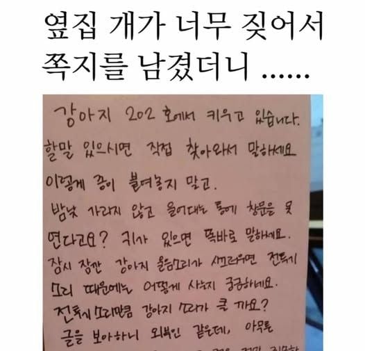 유머옆집 개가 너무 짖어서 쪽지를 남겼더니위키뉴스 기자입력북마크공유가글자크기프린트댓글 개가 너무 짖어서 쪽지를 남겼더니..jpg 위키뉴스 기자[email protected]카카오톡페이스북트위터밴드URL복사