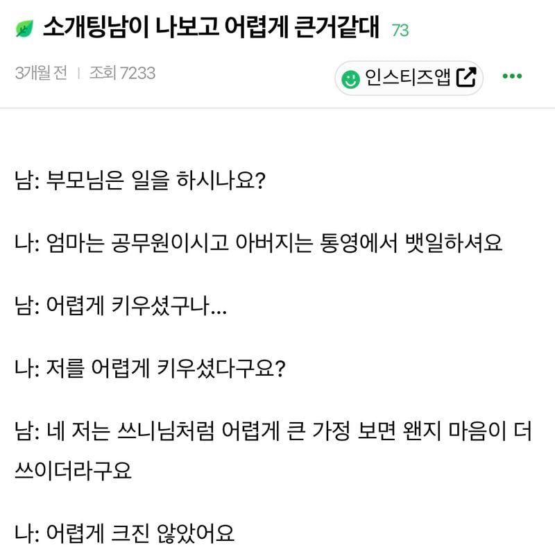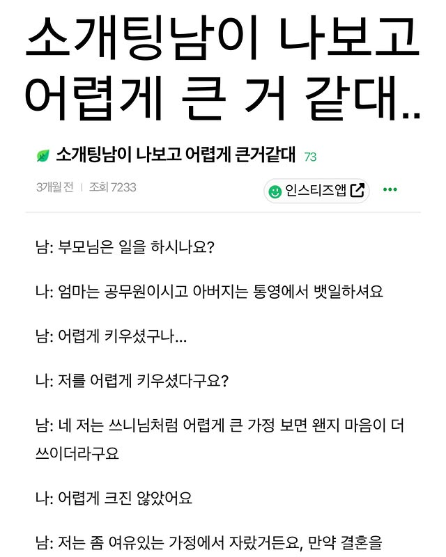 유머소개팅남이 나보고 어렵게 큰 거 같대...위키뉴스 기자입력북마크공유가글자크기프린트댓글소개팅남이 나보고 어렵게 큰 거 같대 위키뉴스 기자[email protected]카카오톡페이스북트위터밴드URL복사