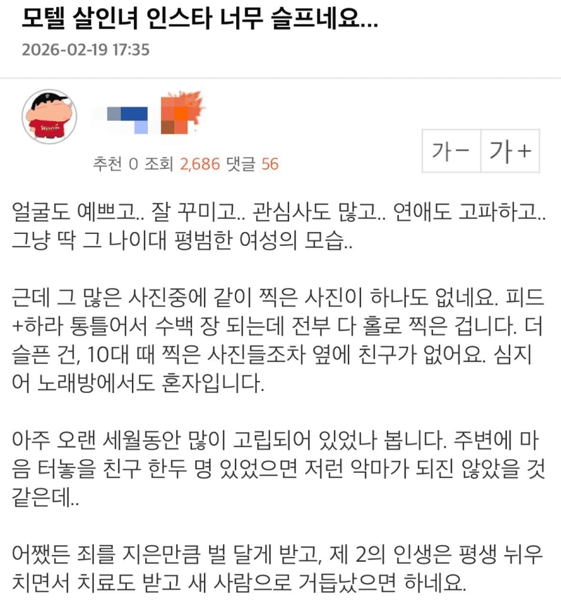 리와인드뉴스강북 모ㅌ 연쇄살ㅇ녀를 본 엠팍 영포티들 반응 ㄷㄷㄷ위키뉴스 기자입력수정북마크공유가글자크기프린트댓글 위키뉴스 기자[email protected]카카오톡페이스북트위터밴드URL복사