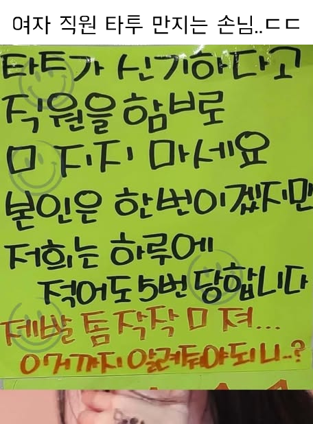 유머여자 직원 타투 만지는 손님..ㄷㄷ위키뉴스 기자입력북마크공유가글자크기프린트댓글여자 직원 ㅌ투 ㅁ지는 손님..ㄷㄷㅁㅊㄴ 많은듯 위키뉴스 기자[email protected]카카오톡페이스북트위터밴드URL복사