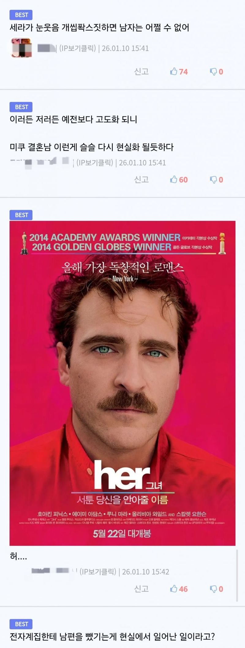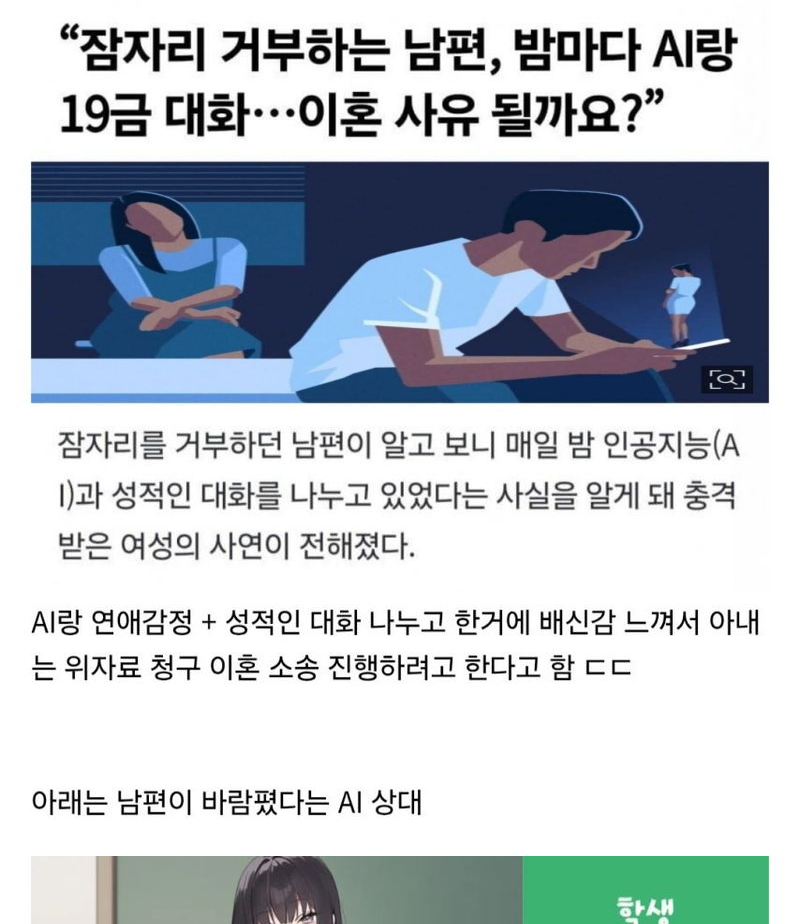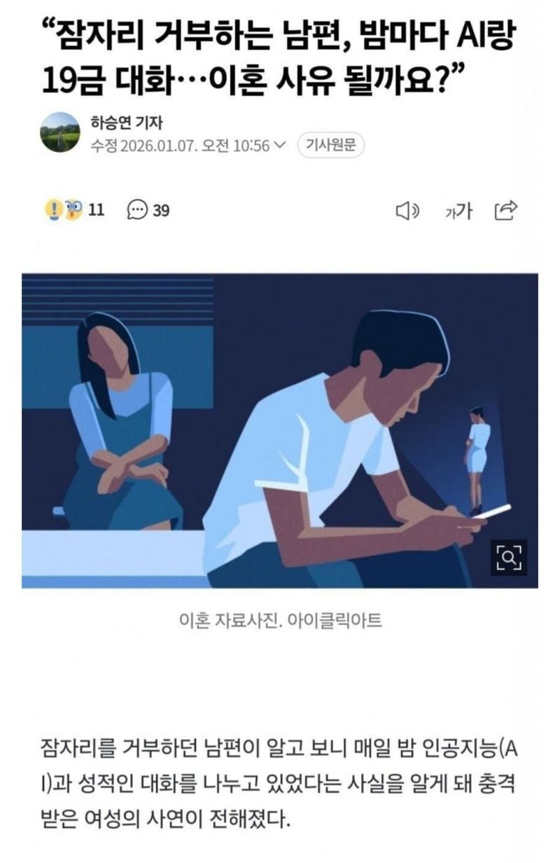 유머AI랑 바람펴서 이혼 진행하고 싶다는 아내위키뉴스 기자입력북마크공유가글자크기프린트댓글AI랑 바람펴서 이혼 진행하고 싶다는 아내 https://m.ruliweb.com/community/board/300143/read/73718147 위키뉴스 기자[email protected]카카오톡페이스북트위터밴드URL복사