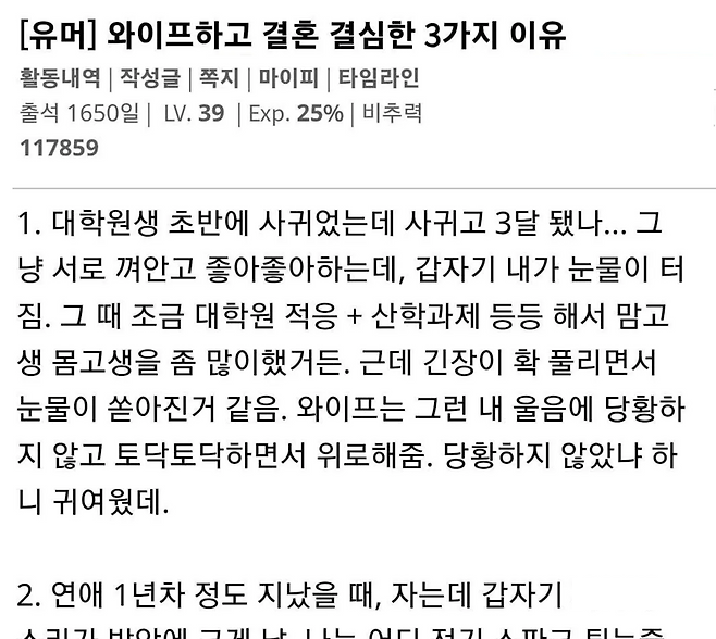 유머한 남자가 지금 와이프와 결혼을 결심한 이유위키뉴스 기자입력북마크공유가글자크기프린트댓글 한 남자가 지금 와이프와 결혼을 결심한 이유위키뉴스 기자[email protected]카카오톡페이스북트위터밴드URL복사