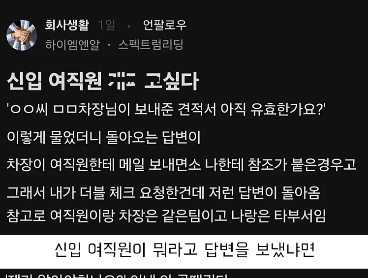 유머신입 여직원 말투때문에 ㅍ고싶다는 직장인위키뉴스 기자입력북마크공유가글자크기프린트댓글신입 여직원 말투때문에 ㅍ고싶다는 직장인 위키뉴스 기자[email protected]카카오톡페이스북트위터밴드URL복사