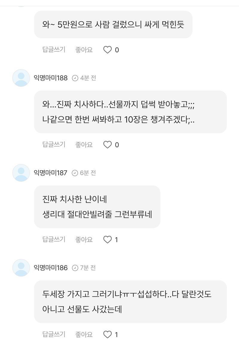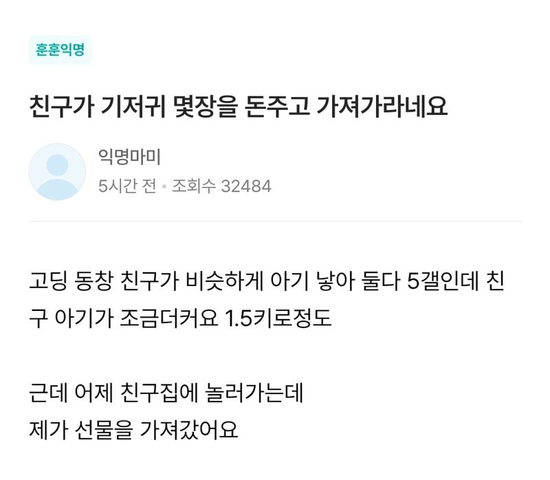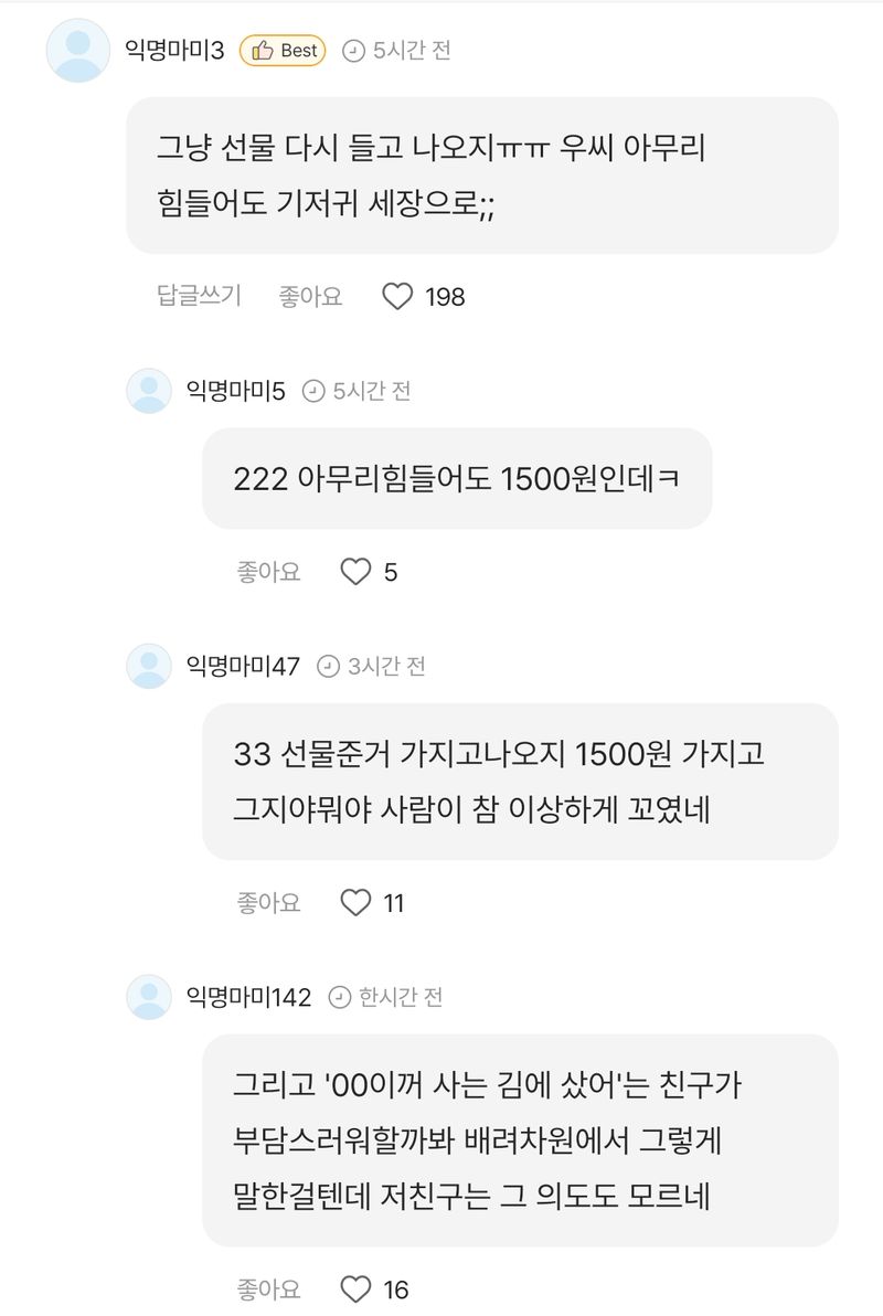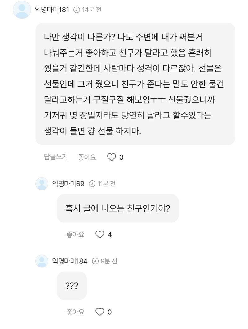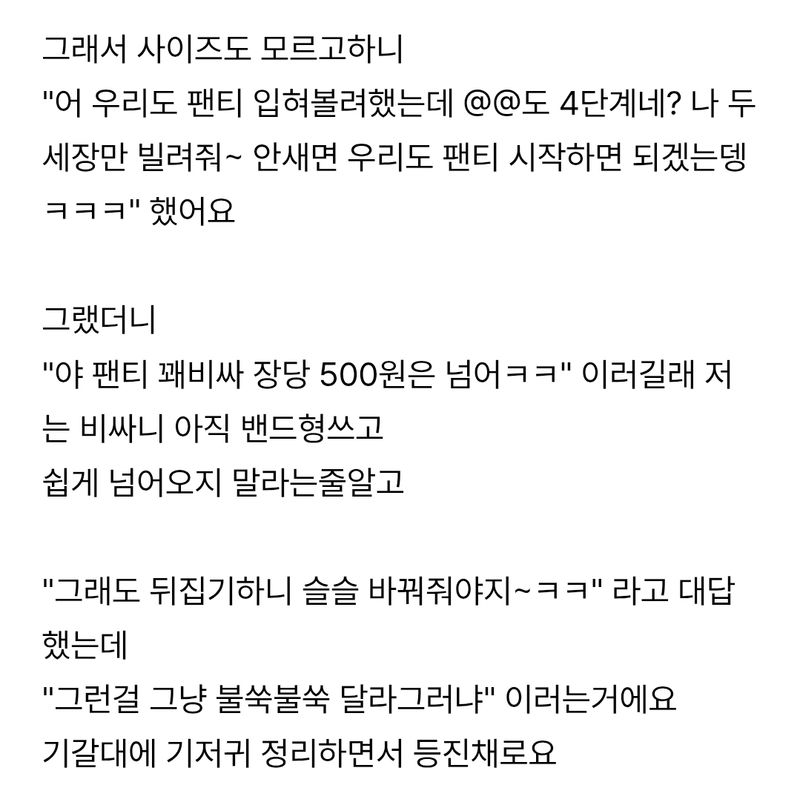유머친구가 기저귀 몇장을 돈 주고 가져가라네요위키뉴스 기자입력북마크공유가글자크기프린트댓글친구가 기저귀 몇장을 돈주고 가져가라네요 위키뉴스 기자[email protected]카카오톡페이스북트위터밴드URL복사