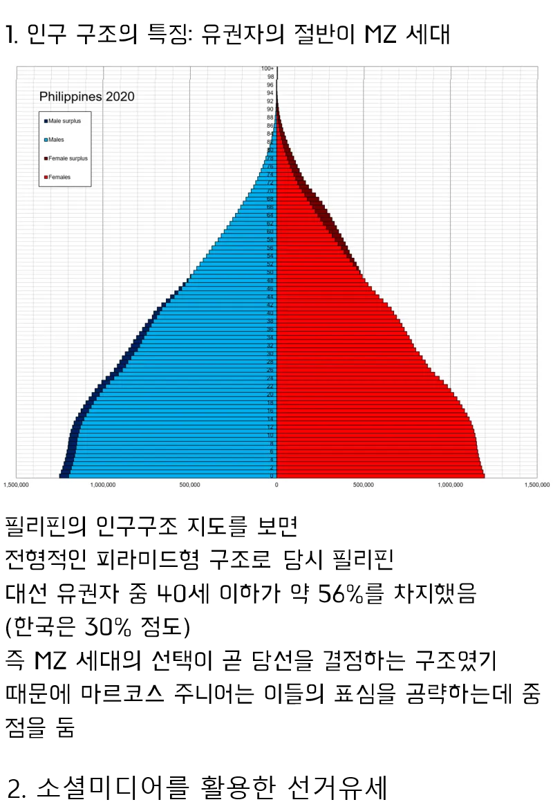 당시 필리핀 대선 유권자 중 40세 이하가 약 56%를 차지했음
