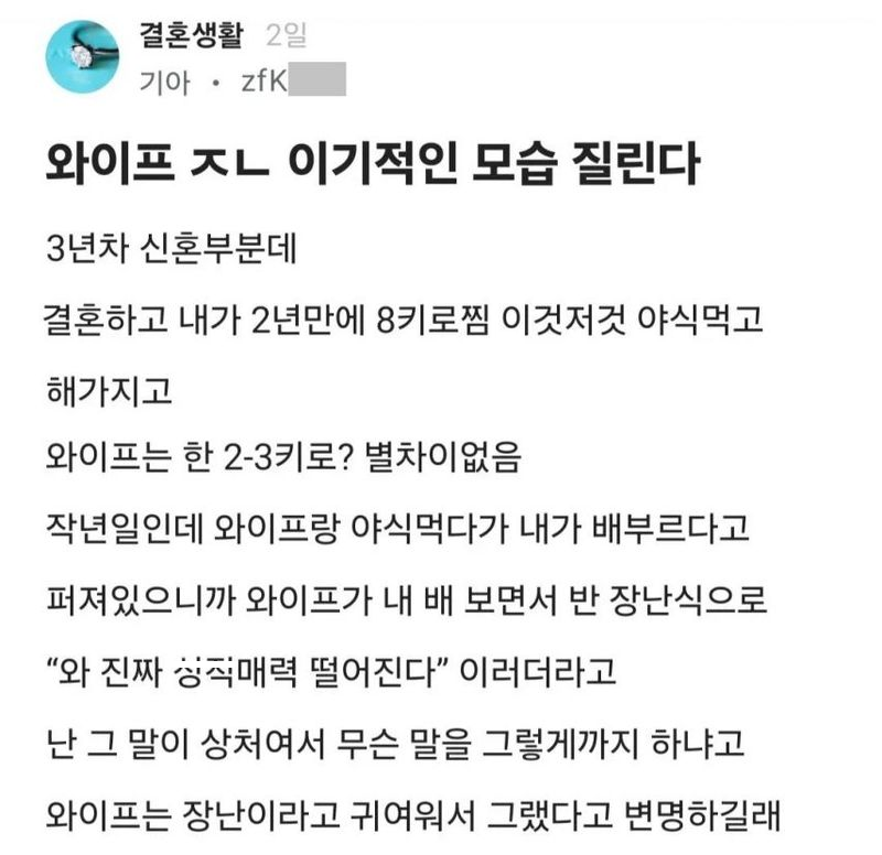 유머블라] 와이프 ㅈㄴ 이기적인 모습 질린다위키뉴스 기자입력북마크공유가글자크기프린트댓글블라] 와이프 ㅈㄴ 이기적인 모습 질린다위키뉴스 기자[email protected]카카오톡페이스북트위터밴드URL복사
