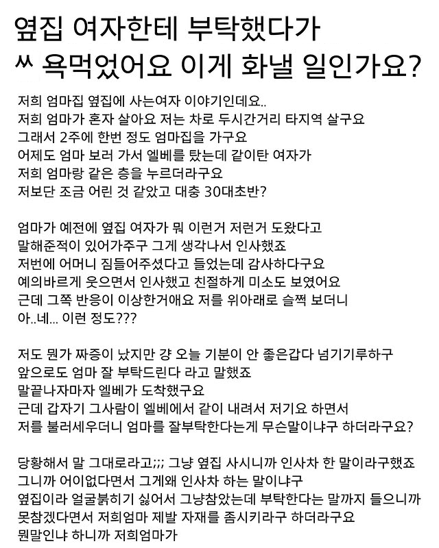 유머옆집 여자한테 부탁했다가 ㅆ욕먹었어요 이게 화낼 일인가요?위키뉴스 기자입력북마크공유가글자크기프린트댓글옆집 여자한테 부탁했다가 쌍욕먹은 판녀 위키뉴스 기자[email protected]카카오톡페이스북트위터밴드URL복사