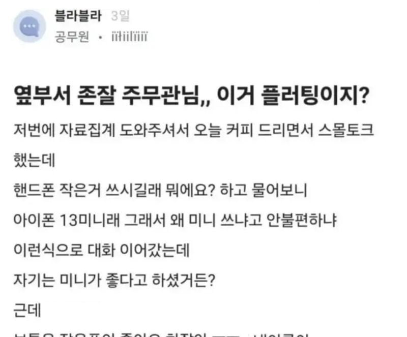 리와인드뉴스옆부서 존잘 주무관님... 이거 플러팅이지?위키뉴스 기자입력북마크공유가글자크기프린트댓글 옆부서 존잘 주무관님... 이거 플러팅이지? 민희... 미니위키뉴스 기자[email protected]카카오톡페이스북트위터밴드URL복사