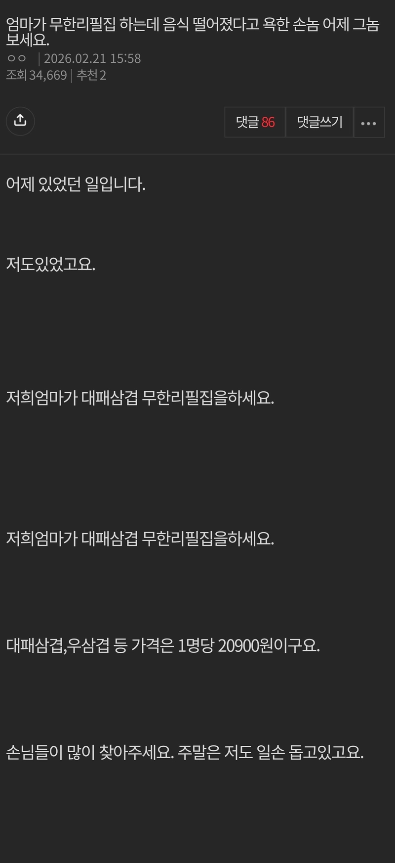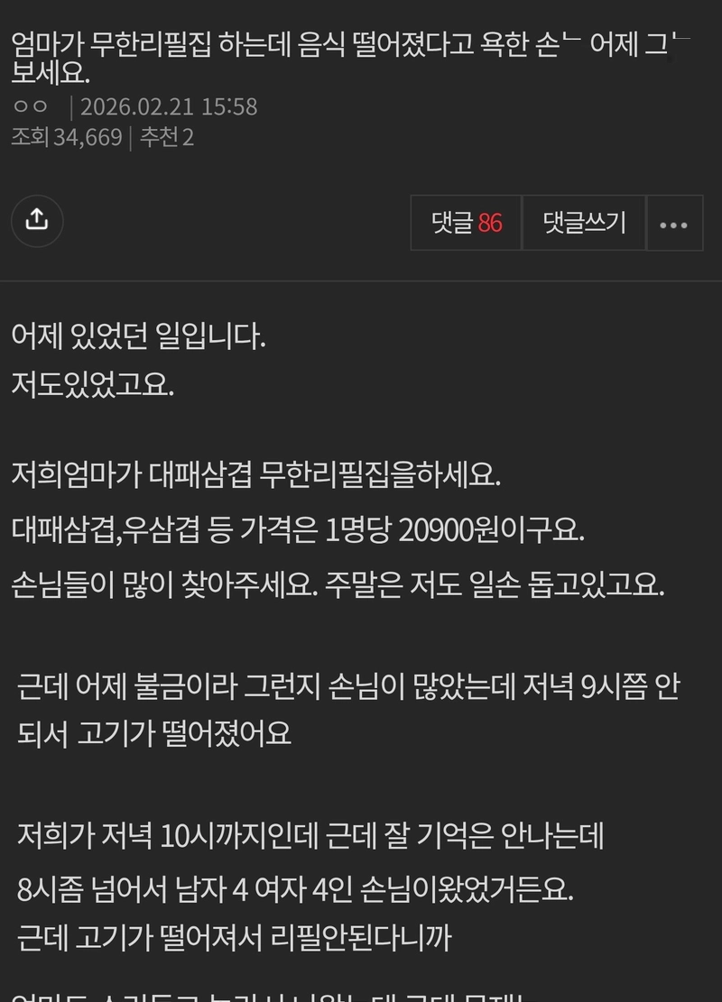 리와인드뉴스엄마가 무한리필집하는데 음식 떨어졌다고....위키뉴스 기자입력북마크공유가글자크기프린트댓글 엄마가 무한리필집하는데 음식 떨어졌다고.... 욕한 손님 보세요.위키뉴스 기자[email protected]카카오톡페이스북트위터밴드URL복사