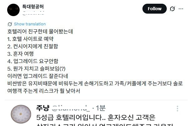 유머호텔 갈때마다 업그레이드 된다는 사람위키뉴스 기자입력북마크공유가글자크기프린트댓글호텔 갈때마다 업그레이드 된다는 사람 납득 완 다크서클도 챙겨가자위키뉴스 기자[email protected]카카오톡페이스북트위터밴드URL복사