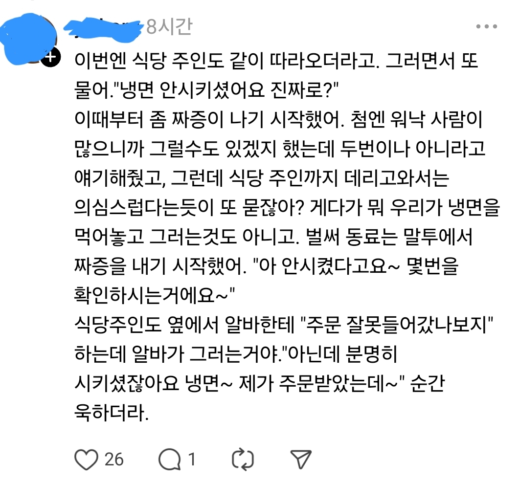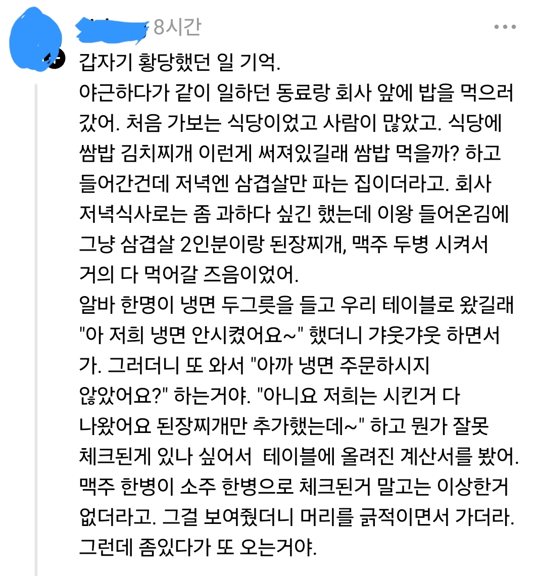 유머야근하다가 같이 일하던 동료랑 회사 앞에 밥을 먹으러 갔어위키뉴스 기자입력북마크공유가글자크기프린트댓글쓰)야근하다가 같이 일하던 동료랑 회사 앞에 밥을 먹으러 갔어 . . . 위키뉴스 기자[email protected]카카오톡페이스북트위터밴드URL복사
