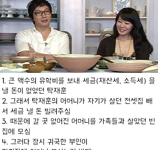 1. 큰 액수의 유학비를 보내 세금(재산세, 소득세) 을 낼 돈이 없었던 탁재훈