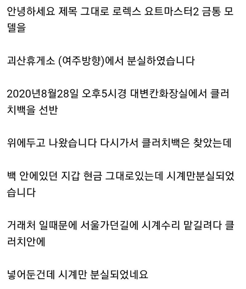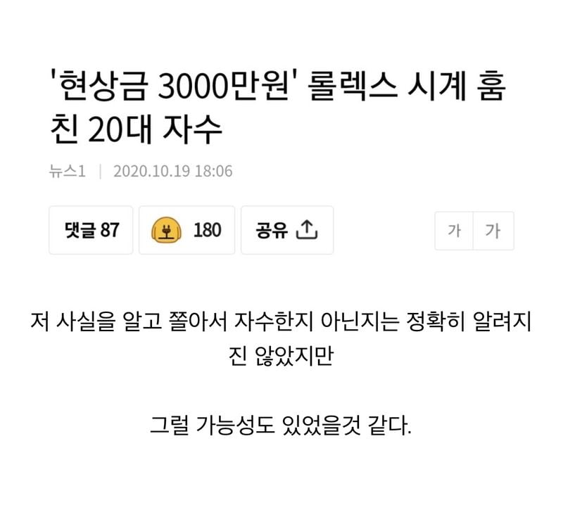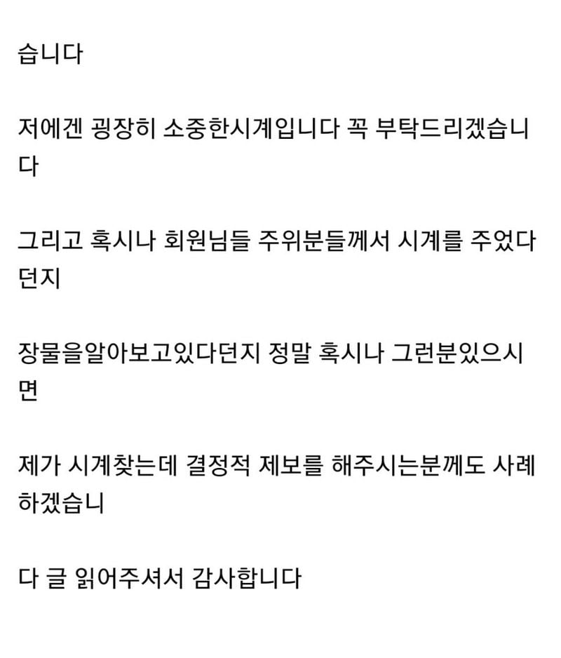 유머사례금만 3천만원이였던 시계 분실 사건의 결말 ㄷㄷ위키뉴스 기자입력북마크공유가글자크기프린트댓글사례금만 3천만원이였던 시계 분실 사건의 결말 ㄷㄷ 위키뉴스 기자[email protected]카카오톡페이스북트위터밴드URL복사