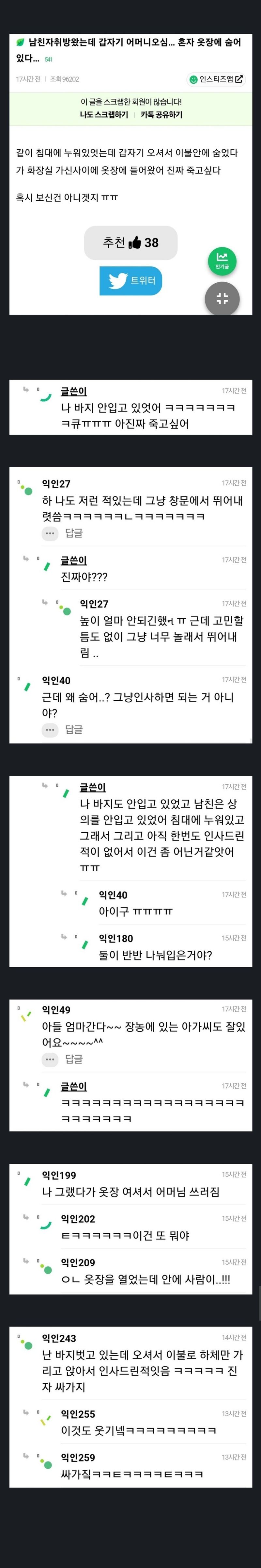 유머남친 자취방 왔는데 갑자기 어머니오심 ㄷㄷ위키뉴스 기자입력북마크공유가글자크기프린트댓글남친자취방왔는데 갑자기 어머니오심… 혼자 옷장에 숨어있다… 위키뉴스 기자[email protected]카카오톡페이스북트위터밴드URL복사
