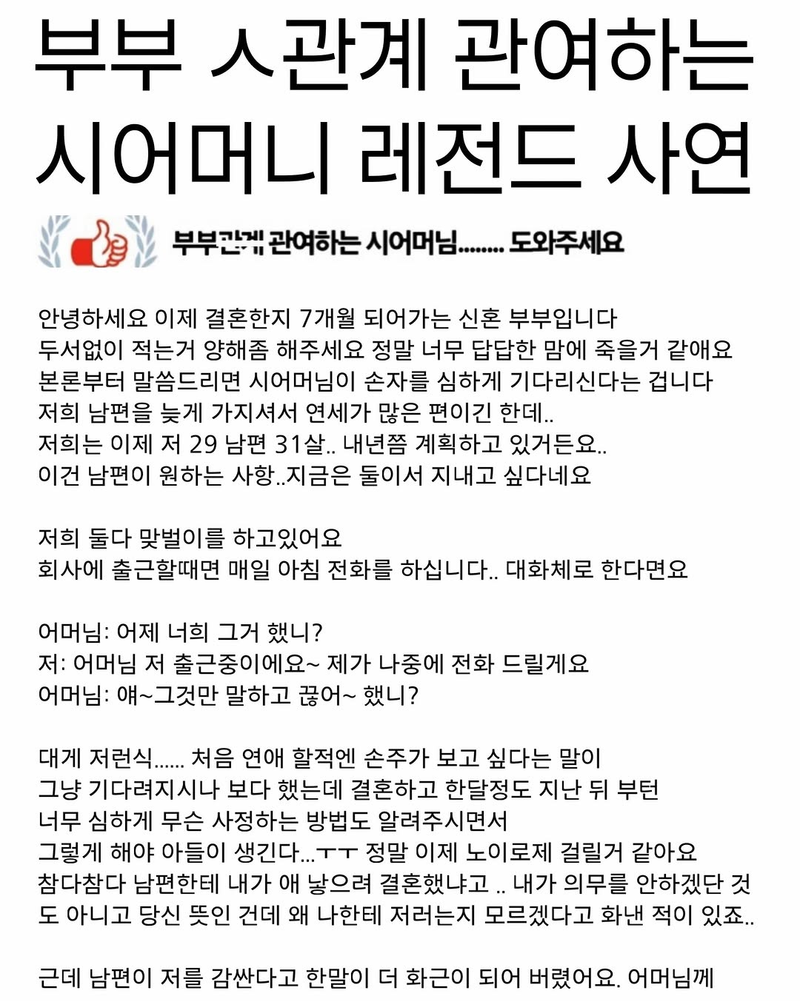 유머부부 ㅅ관계 관여하는 시어머니 레전드 사연위키뉴스 기자입력북마크공유가글자크기프린트댓글부부관계 관여하는 시어머니 레전드 사연 위키뉴스 기자[email protected]카카오톡페이스북트위터밴드URL복사