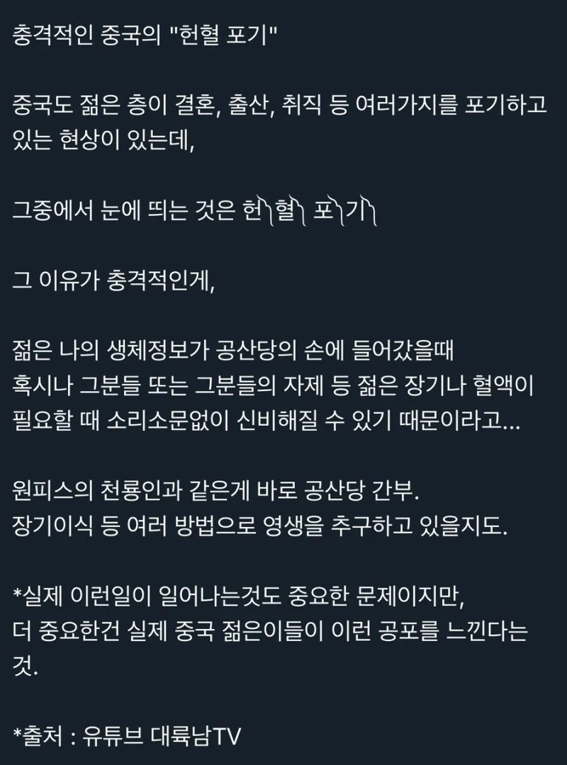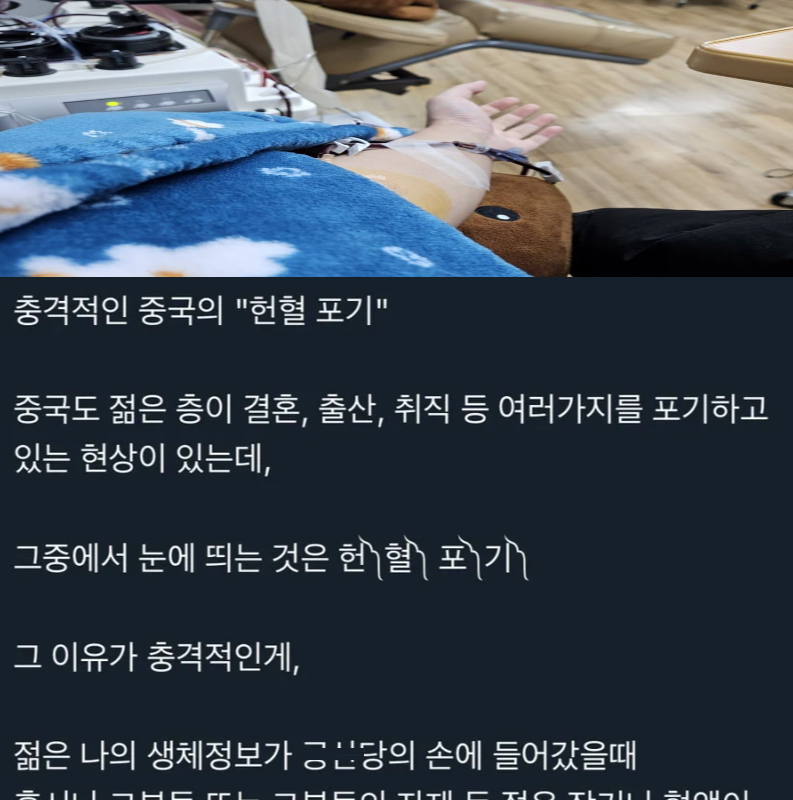 유머중국인들이 헌혈 안하는 이유...위키뉴스 기자입력북마크공유가글자크기프린트댓글바늘 계속 쓰거나, 300ml 뽑는다 하고, 500ml 뽑고 그런 이유 때문이 아니었어요...?위키뉴스 기자[email protected]카카오톡페이스북트위터밴드URL복사