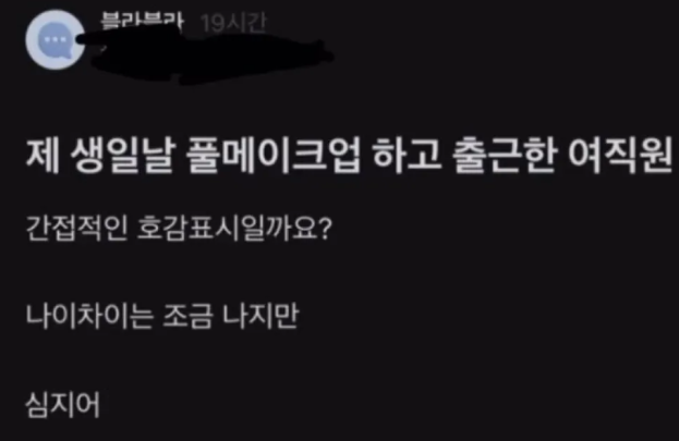리와인드뉴스제 생일날 풀메이크업 하고 출근한 여직원위키뉴스 기자입력북마크공유가글자크기프린트댓글 제 생일날 풀메이크업 하고 출근한 여직원 위키뉴스 기자[email protected]카카오톡페이스북트위터밴드URL복사