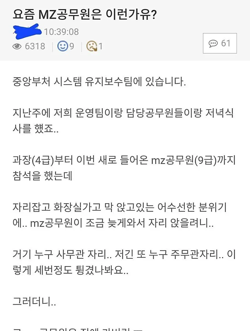 유머MZ 공무원 회식 논란위키뉴스 기자입력북마크공유가글자크기프린트댓글 MZ 공무원 회식 논란 저기 앉으세요 한마디 하는게 어렵나위키뉴스 기자[email protected]카카오톡페이스북트위터밴드URL복사